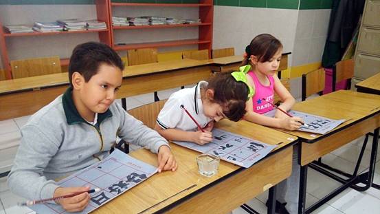 其实,倘若学生少,这些小学生都是小天使。星期一和星期三晚上的班比较特殊,这些学生据说是经过精心挑选出来的智商高于普通人群的,有一个学生是世界上最年轻的心理学家,叫达芙妮,她偶尔会帮助我管理课堂,省了我不少脑细胞。然而他们喜欢玩游戏,于是,我改编了很多童年游戏和综艺游戏并运用到课堂上。如,“二十一点”、粤语游戏“汆汆转菊花园”、“老鹰抓小鸡”、“盖棉被”、“摸瞎子”、“爱的抱抱”、当年的微博热门游戏“你画我猜”、词语接龙、口不对心、萝卜蹲、TVB掌门人游戏“开口中”、“传话筒”……用各种游戏吸引他们的注意力。除了游戏之外,文化也是一支吸引学生的魔法棒。为了教汉语,我无所不用其极,书法、葫芦丝、武术、剪纸、太极扇、《狐假虎威》表演、筷子夹生词、自制词卡、自制中国纸扇、自制五星红旗、自制灯笼、自制对联、自制书签,等等。汉语教学是勇往直前,也是自娱自乐。