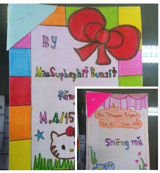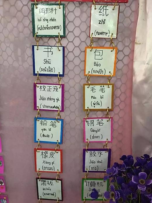 于乐。说到奖励,泰国学生很喜欢中国的花花绿绿的贴纸,颜色越丰富越好,只要有奖励,他们就表现得异常积极,建议国内即将赴泰的老师在这方面多做准备。我使用的教材是体验汉语,学生没有课本,教会他们拼读后,教学内容由简到难,但是课堂上前三个月我只写拼音,对于零基础的学生来说,写汉字他们会很反感,后面的课程才慢慢涉及汉字书写。学生没有教材,又是零基础,学校没有多媒体,很多时候教授新的东西,我都是提前制作图片,图片教学直观易接受。比如教水果时,我自己制作了一套水果的图片,十六个班都可以用,不管是教课还是复习图片都发挥了大作用。学生不喜欢写作业,但他们动手能力很强,比起让他们写作业,他们更喜欢制作。教字母时我就让每个学生制作一个字母卡片,教水果是就让他们画自己最喜欢的水果,他们很有创意,把自己的图片装饰的很漂亮。学了汉语之后,每次学生遇见我,不再只是行合十礼,他们还会问候“你好”“吃饭了吗?”,他们经常说汉语很难,但他们学会一句就爱不释手,看到他们这么认真可爱,即使汉语教学任务艰巨,我也总是有满满的热情。