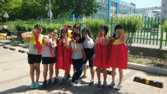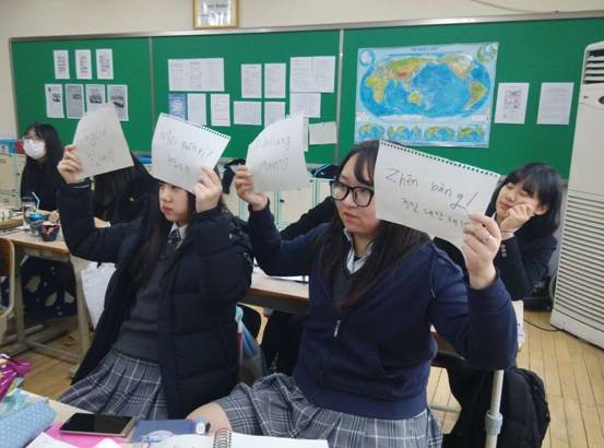 课堂用语方面,我所懂得的韩语有限,而大部分学生是没有学习过汉语的,即使高二年级学过一年,但是因为课程量少,也都是非常基础的阶段,这给我带来了很大的挑战,金老师让我尽量跟孩子们说汉语,让她们感受标准的发音,但是因为学生水平低,有时候我做出的汉语指令学生都无法做出回应。所以最后我想到的办法就是在课堂上我尽量学习一些课堂用语的韩语表达,在初期的时候,先说完汉语指令,会再说韩语,久而久之,学生了解到了句子的意思以后则不再说韩语。