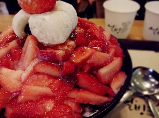 女生都爱甜品,那就一定要来韩国尝尝这里的甜品,这里的甜品非常精致,草莓雪冰,上面是铺了满满的一层草莓,用料十足;抹茶雪冰更是让我们惊喜不已,本以为只有表层的抹茶粉,没想到一层一层地挖下去,一层一层的抹茶粉铺在冰沙里,吃的时候感到很幸福。有的店铺甚至给甜品起了一个非常优雅美丽的名字,而且还是汉语名字,只可惜自己当时没有拿相机拍下来。