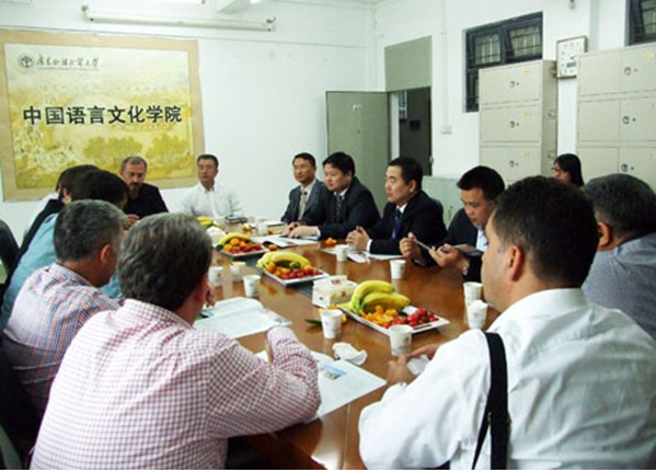 此后,土耳其来宾于三教422与中文学院的相关领导和老师,就合作事宜进行了深入探讨。中文学院院长陈彦辉介绍了双方合作的几种形式,包括建立孔子学院、建立中国文化中心以及派遣志愿者教师到当地进行短期汉语教学合作,并详细说明了这几种合作方式的申请流程及条件。他表示会积极提供相关资料供对方参考并配合他们进行申请工作。区长一行十分重视与广外的合作,称将尽快与当地的相关单位进行沟通,争取早日与我方达成协议,并说非常期待与我们的密切交流与合作。