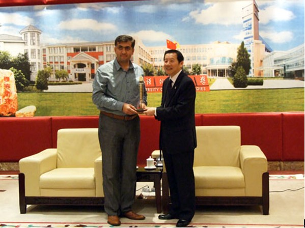 首先,在行政楼贵宾厅举行了土耳其来宾与我校领导简短的见面仪式。在会面中,Dr. Serdar KALAYCI称此次来广州是与越秀区商谈“友好城区”的合作事宜,并通过我校土耳其籍汉语国际教育硕士生萨立介绍,到我校进行参观访问,以及了解汉语教学合作项目的相关信息。Dr. Serdar KALAYCI指出,当今土耳其与中国的关系密切,交流频繁,他十分支持两国的友好往来。他表达了与我校进行汉语教学合作的强烈愿望,并称在当地有许多高中及大学希望开设汉语课或建立孔子学院。方凡泉在简要介绍了我校的情况后,表示十分愿意与Meram区合作并提供相关的教学资源。方凡泉还特别询问了关于两国语言障碍的问题,Dr. Serdar KALAYCI表示英语在土耳其是通用语言,因此不必担心我国派出的志愿者会遇到交流障碍。会后,双方还互赠了纪念品。