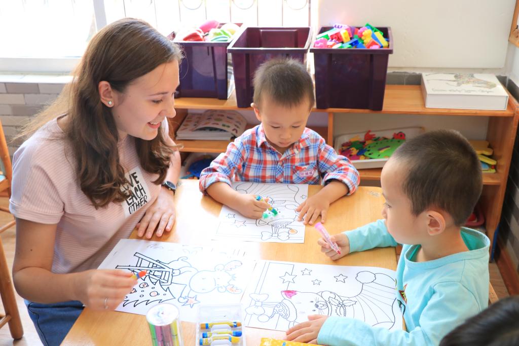 留学生老师教孩子们涂鸦、画画