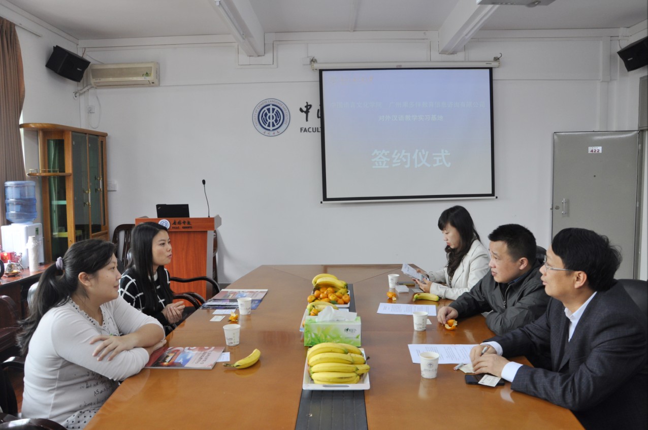 2013年11月20日,中国语言文化学院与广州果多伴教育信息咨询有限公司共建对外汉语教学实习基地签约仪式在中文学院会议室举行。中文学院副院长魏慧斌、对外汉语系主任严修鸿、汉语国际教育中心主任彭淑莉,广州夥伴国际语言学校副校长周少玮出席了本次仪式。