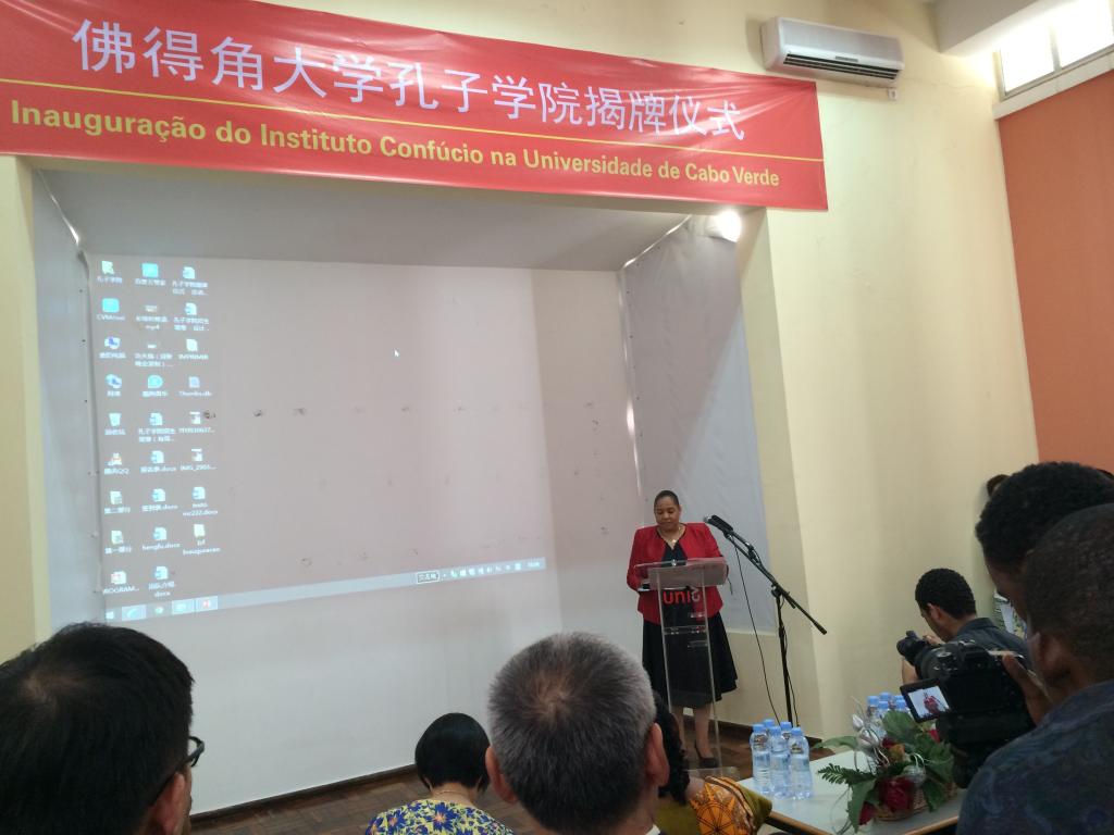 孔子学院总部总干事、国家汉办主任许琳发来贺信,祝贺佛得角大学孔子学院成立。贺信分别由孔子学院中外方院长用汉语和葡语双语宣读