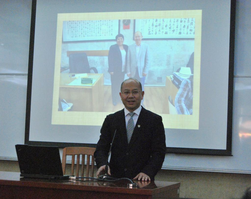 黄露阳首先简单介绍了彭启贵老师,而后,中文学院院长伍方斐教授向彭启贵赠送了纪念品。随后讲座正式开始,彭教授介绍,位于秘鲁阿雷基帕这座世界历史文化遗产城市的圣玛利亚天主教大学孔子学院堪称“世界最好的孔院之一”,其独特之处在于有一个古典而优雅的校园,而该处就是秘鲁国会大厦的旧址。该孔子学院始于2009年4月正式开始招生,至今已有六年历史。