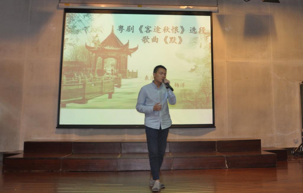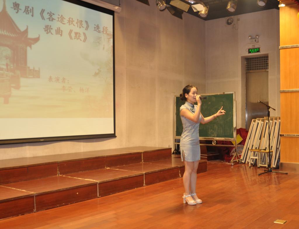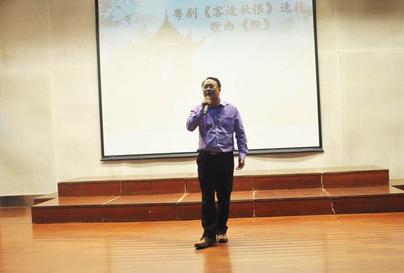 全场令大家尖叫不已的歌唱节目当属严修鸿教授演唱的粤北客家民谣《落水天》,听闻大家学西语,有大舌音难学的问题,他有意把读l-母的那些字以颤音方式唱出来,赢得了在场全体师生此起彼伏的的掌声和欢呼尖叫声。一场欢歌,犹不忘教学,寓教于乐也。