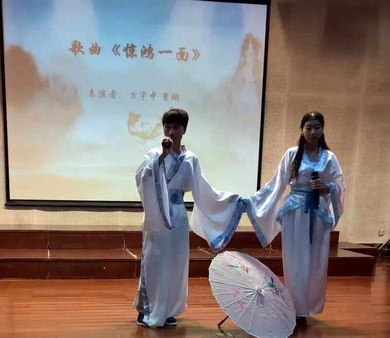 晚会节目全由16级新生自编自演,以多样文化交流为旨。当晚表演的同学精彩地演绎了一首又一首的经典名曲和流行歌曲,让全场观众感受到了演唱者们那一份激情,引发了现场接连不断的小高潮。经典粤剧《客途秋恨》选段和现代流行歌曲《默》完美结合,表现了汉硕学子既拿捏得了经典旋律,也把握得住流行的节奏;《惊鸿一面》节目中男女深情对唱表现了江南古典美;中英俄德法日韩西泰九国语言串唱流行歌曲《If You》,引得全场阵阵欢呼声,展现了同学们优秀的语言才华;粤语歌《喜欢你》和《红日》联唱同样表现不俗。诗歌是音乐演唱的另一种方式。在婉转悠扬的轻音乐伴随下,学硕学生用各自方言朗诵了现代诗《雨巷》,耳目一新,别具一番趣味。