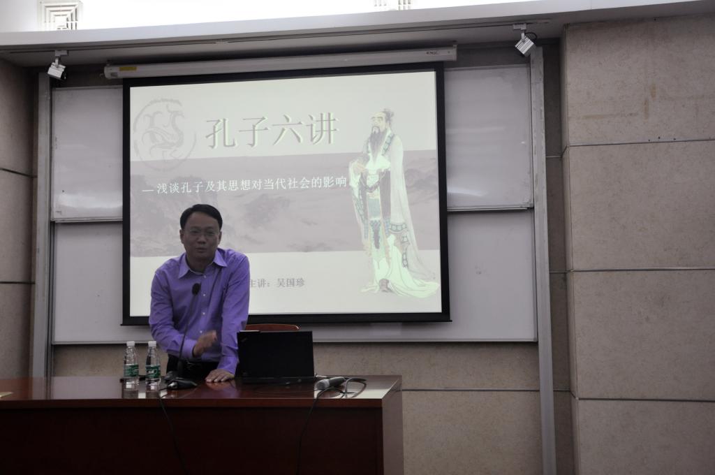 吴国珍老师先介绍了孔子生活的轴心时代。在人类精神文明突破的这段时间,四大文明古国都出现了精神导师、思想家。孔子作为其中一员,发现并总结先人智慧结晶使之传播开来。吴老师指出轴心时代世界文明区域的生存条件相似,产生的理论也相似,这些学说都是人类的共同智慧。他以中庸思想为例,通过讲解几个日常生活例子,劝告同学们对内对外都要做到中庸之道。同时,他再次强调这些学说思想的重要性,不但塑造了各自的文化传统,而且将会一直影响着我们的生活。