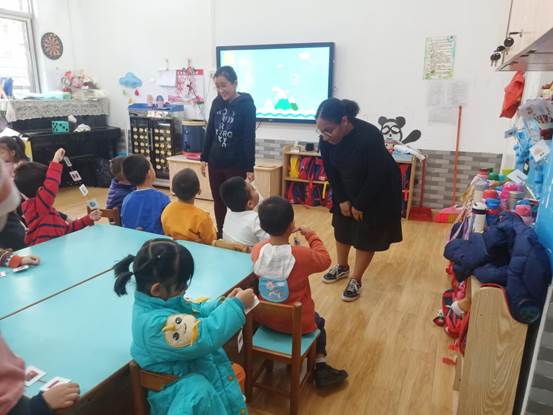第三个环节是老师与小朋友们围绕“认识国家”的主题玩游戏。老师和小朋友玩了投骰子、拼图等游戏,并邀请每组的小朋友和幼儿园的老师一起玩卡片游戏。小朋友投入其中,都能很快说出答案,积极配合和回应老师。冬日里窗外阳光透入教室,形成一圈圈的光晕,老师和孩子们的笑容也犹如这冬日的阳光,温暖了寒冬中的我们。