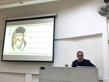 讲座的第一部分,在讲到罗明坚来华背景和简介时,陈教授从中西文化交流背景的演变出发,通过讲述沙勿略的传教故事引出第一个进入中国中原地区的传教士——罗明坚,继而讲述了罗明坚的生平履历和主要成就,如罗明坚绘制的《中国地图集》是西方绘制出的第一部中国地图集。在谈到罗明坚所用的汉语教材时,陈教授从《千字文》、《幼学琼林》、《通俗故事》、《千家诗》以及“四书”出发,通过图文并茂的生动讲解,展示了罗明坚学习汉语的全过程,并在现场深入浅出地带领大家一起分析罗明坚所写诗句中的学习痕迹。