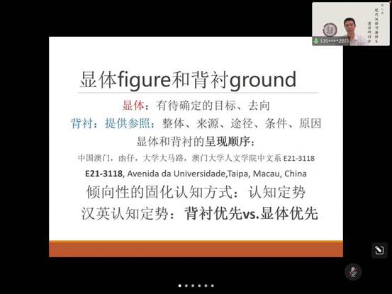 陈教授还指出,不同的语言文化对显体背衬的处理是不一样的。汉语背衬优先,从外到内。而英语显体优先,从内到外。语言是反应认知方式的窗口,为了进一步介绍显体-背衬理论,陈教授以姓名、空间方位、数量关系、打折、剩余车位、检票退房为例子,揭示中国式认知方式跟欧美认知方式之间的内在方式。