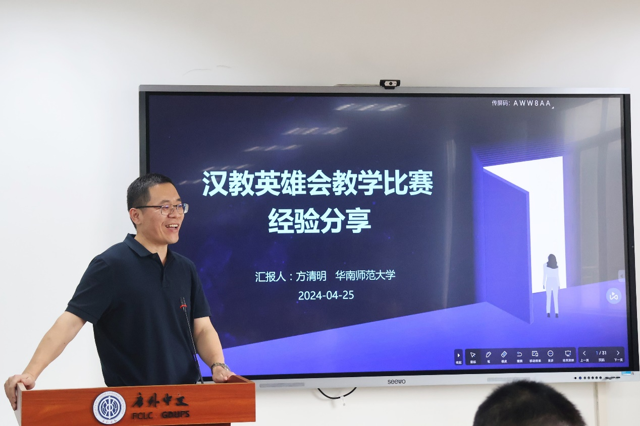 2024年4月25日下午,由广东外语外贸大学中国语言文化学院开展的国际中文教育名家论坛之二在第七教学楼408室举行。本次讲座题为“汉教英雄会教学比赛经验分享”,由华南师范大学国际文化学院、广东省中国语言学会秘书长方清明教授主讲,我院邱春安教授主持。