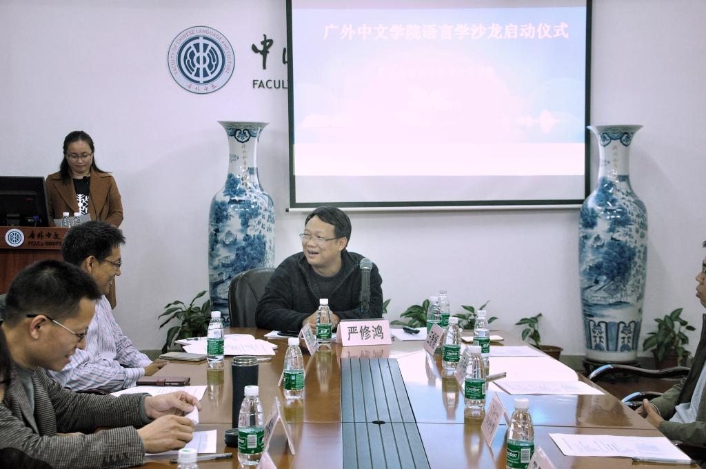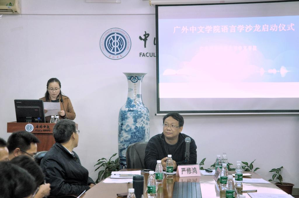 广外中文学院语言学沙龙启动仪式暨第一期活动于12月8日晚7点在中文学院会议室圆满举行。启动仪式由对外汉语系主任王媛媛副教授主持。出席启动仪式的领导嘉宾有:中文学院副院长李斌教授、中文学院语言学学科带头人严修鸿教授、汉语国际教育中心黄露阳主任、语言学教研室主任邱春安副教授、汉语国际教育教研室杨帅可主任、对外汉语系贝先明副教授、杨慧君博士、丁沾沾博士、王思齐博士以及语言工程与计算实验室冯文贺博士。