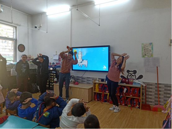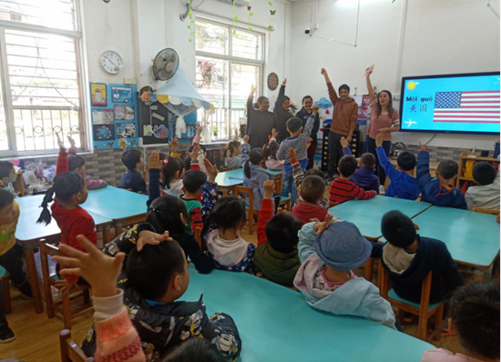 教学的第二环节是进入具体国家的学习。老师们依次给小朋友介绍了美国、秘鲁、巴新、印尼四国的国旗和标志物,并带领小朋友们一起做简单的动作来模仿自由女神像、羊驼、袋鼠和草裙舞的动作。老师们充分调动起了小朋友的积极性,让小朋友动起来,他们笑得眼睛都眯起来了,模样可爱极了。