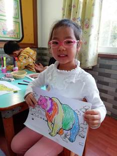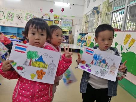 第二个环节是发有关泰国各个方面特色的画纸给中一班的小朋友进行涂色,发挥他们的想象力,要求小朋友能根据泰国同学介绍的东西的特点进行涂色。小朋友涂完颜色之后,泰国同学给每一位小朋友送了一个小象钥匙扣作为纪念。