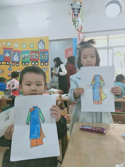 在小朋友对越南奥黛有了初步认识后,老师们给每个小朋友分发了奥黛的图片,让他们涂上自己喜欢的颜色。小朋友们争先恐后地把涂好颜色的奥黛展示给老师看。那些期待表扬的小眼神让老师们忍俊不禁。