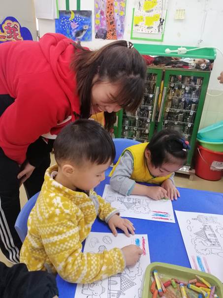 示范结束后,小朋友们分组进行折纸活动,幼儿园老师和义教老师、同学分别进小组指导小朋友折纸。小朋友们在老师的指导下,折好礼物盒后,就开始给折好的礼物盒涂各种图案和颜色,准备回家送给爸爸妈妈,真是一群天真、可爱、活泼的小天使。