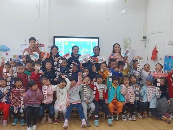 最后,老师们给孩子们送礼物并与孩子们合影留念。义教活动接近尾声,细心的老师们还给小朋友准备了特别的礼物——手工制作的国旗卡片。老师给孩子们分派礼物时,孩子们非常高兴和感动,一些小朋友甚至还跑到老师跟前与老师拥抱。同时小朋友们也回赠了贴纸和手工制作的盘子给老师们,教室里洋溢着欢乐的气氛。