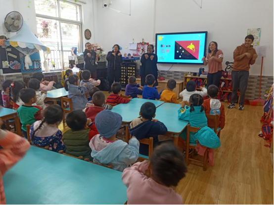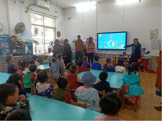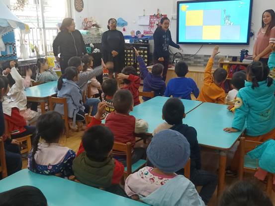 第三个环节是老师与小朋友们围绕“认识国家”的主题玩游戏。老师和小朋友玩了投骰子、拼图等游戏,并邀请每组的小朋友和幼儿园的老师一起玩卡片游戏。小朋友投入其中,都能很快说出答案,积极配合和回应老师。冬日里窗外阳光透入教室,形成一圈圈的光晕,老师和孩子们的笑容也犹如这冬日的阳光,温暖了寒冬中的我们。