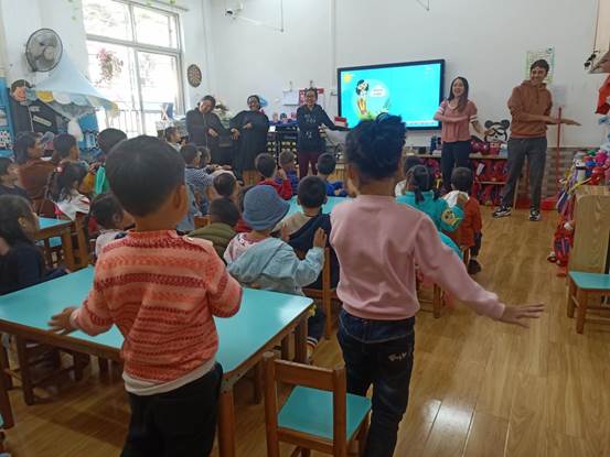 三位来自越南的汉硕留学生被分配到中二班进行义教。一进入教室,小朋友们纷纷带着期待的小眼神向越南留学生问好,有的人说“老师好!”,有的人说“姐姐好!”,接着安静乖巧地坐在自己的小椅子上等待上课。