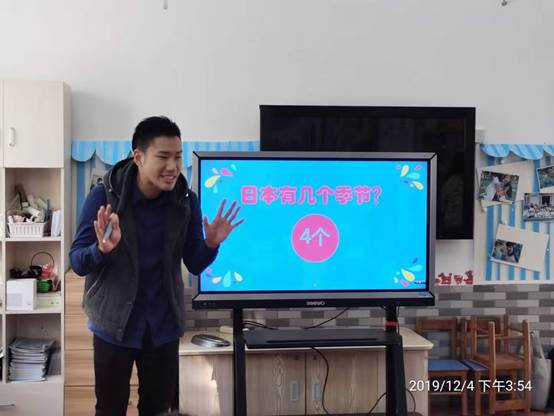 两位来自日本的汉硕留学生被分配到幼儿园大二班进行义教。王媛媛老师作为本次义教活动的指导教师参与到了日本留学生组织的课堂教学活动中。日本同学的教学活动分两个环节。一是由长野匡介绍日本的季节和每个季节的代表景色,二是由镰田隆希教小朋友折纸。