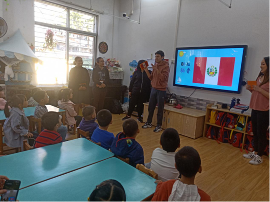 玛拉娣(印尼)、曹璐诗(秘鲁)、胡凯乐(秘鲁)、周雅(巴布新几内亚)、国华(美国)五位汉硕留学生面向广外幼园大三班的小朋友们开展以“认识印尼、秘鲁、巴新、美国四个国家”为主题的义教活动。