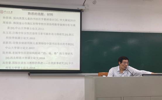 接着,周教授分别从选题分解、理论提升、材料收集、研读前人成果、凝练创新点、探索性研究与改善六个方面具体阐明了研究设计所需涵盖的内容。周教授首先以两篇论文为例,对选题分解的必要性进行了强调,他指出课题只有分解成小问题,才能逐个、有序地推进研究。然后周教授引用了大量的例子阐述了选题与理论、假说、模式、方法的关系,并以《基于语料库的疑问代词“怎么”的偏误分析》为例介绍了确定文献阅读的范围以及文献研读时要注意的事项。
