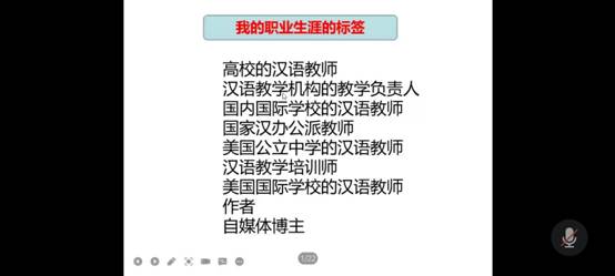 其次,刘志刚老师围绕“什么是汉语教师?”这一问题,为我们展示了十几位世界各地的汉语教师的汉语课堂。在展示真实的课堂教学视频中,我们感受到了不同类型的汉语课堂教学的魅力,最后刘老师总结:汉语教师所面临的教学对象、教学环境、所采用的教学理念、教学方法都各有不同,汉语教师内涵十分广泛,教学各有特点,因此,作为一名合格的对外汉语教师,在实际的教学过程中,应根据不同的教学对象、教学环境、教学内容,设定合理的教学目标,从而进行合理的教学课堂设计。