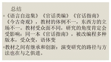 随后,张教授详细讲解了域外的教材,包括东方邻国朝鲜、日本及琉球地区。第一,朝鲜汉语教材。张教授重点讲解了《老乞大》、《朴通事》以及《训世评话》的主要内容及用途,介绍了朝鲜明代教材《忠义直言》以及清代早期和晚期的教科书,指出朝鲜汉语教材风格过于单一,自学型系列教材多,沿用成分大,独创性弱等缺点。第二,日本汉语教材,分为初级、中级和高级阶段。初级教材以语言训练为主;中级教材则将注意力转向专业素质的培养以及一些专业中国语;高级阶段则主要关注中国古代通俗小说的阅读。张教授还指出,到了明治时期,汉语教材在内容、口语、价值取向上发生了重大改变,汉语变成了向中国扩张的工具。《语言自迩集》对日本北京官话教材产生巨大影响,出现了许多由日本人编制的教材,如《亚细亚言语集(支那官话部)》、《清语阶梯语言自迩集》等。此外也出现了各个领域的汉语教材,包括商业、军事等。第三,琉球地区的汉语官话教材,包括《官话问答便语》、《白姓官话》、《学官话》、《广应官话》和《琉球官话集》五种。