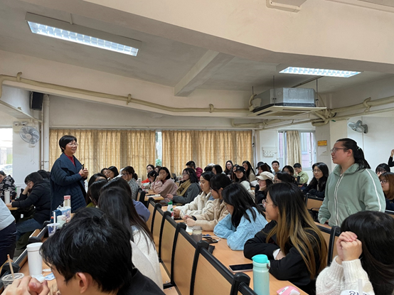 接下来,吴冠仪老师以一个热点新闻事件导入,阐明教师是一个永远饱含热忱感情的职业。吴老师让同学们尝试思考中学语文教育和对外汉语教学的区别,并进行深入的探讨。她从一个常用的对外汉语教学教案出发,引入课堂教学设计环节,带领学生探讨“中学语文课堂应该如何设计”这一话题。吴老师以古诗《观沧海》为例,让在场的同学们思考如何更好地设计这一课,并以小说《变色龙》等3篇课文为例,对文章的创作特色进行对比。吴老师生动形象地讲解了如何从教学重点、难点出发,结合不同的作者背景来进行导入、课堂教学等流程。有关中学课程中的“前置性作业”,吴老师解释为“先学后教”,并向大家展示了当前中学学生形式多样的语文作业。