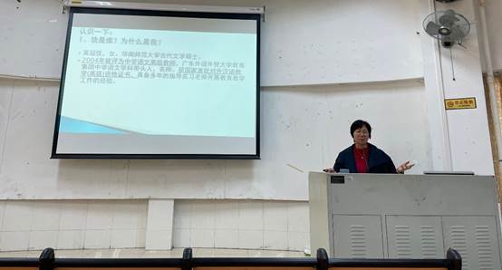 2021年12月30日,广东外语外贸大学附属中学高级语文教师吴冠仪老师,在北校区七教110展开了以“语文好玩,玩好语文”为主题的讲座。