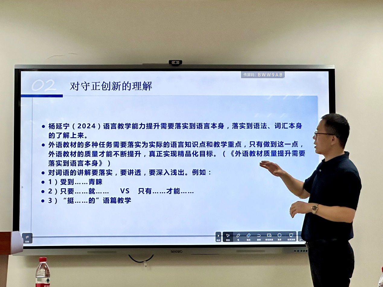 接着,方老师在大赛选题策略及依据上强调内容一定要结合教学理念、有所依据,不要一味地搬运课文内容。并提出要做到“守正创新”,即守住传统,融合创新。