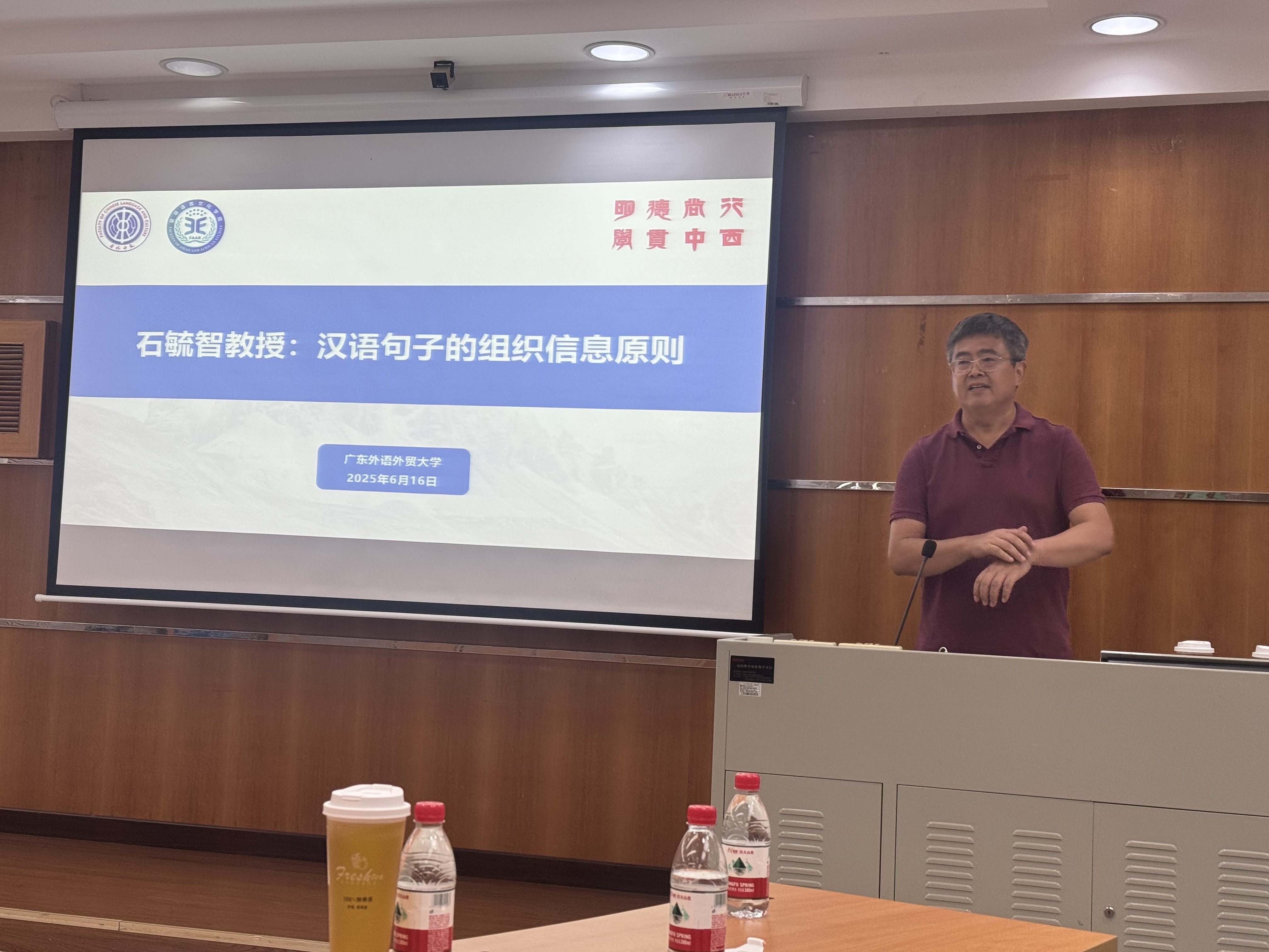 2025年6月16日下午,由广东外语外贸大学中国语言文化学院与亚非语言文化学院共同举办的学术讲座在白云山校区第九教学楼103举行。本次讲座的主题为“汉语句子的组织信息原则”,由新加坡国立大学石毓智教授主讲。